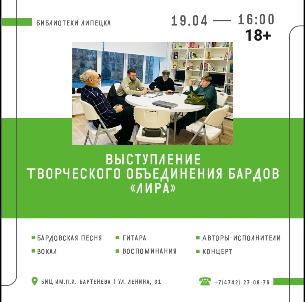 В Бартеневской библиотеке состоится творческий вечер участников творческого объединения бардов «ЛИРА». В программе встречи исполнение авторских композиций, песен известных бардов. Отдельно коснутся творчества известного липецкого музыканта, автора-исполнителя Сергея Порошина. В память о нём на концерте прозвучат его песни о женщинах, весне, музыке.