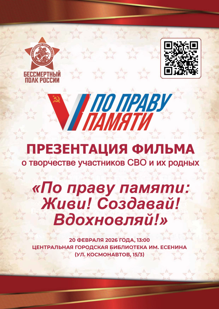 20 февраля в 13:00 в Центральной городской библиотеке им. С. А. Есенина в честь Дня защитника Отечества пройдет Всероссийская акция, организованная общероссийским общественным движением «Бессмертный полк России». В рамках акции состоится показ документального фильма об участниках СВО «По праву памяти: Живи! Создавай! Вдохновляй!». Он был снят об участниках творческого конкурса «По праву памяти» – ветеранах СВО. В 2025 году «Бессмертный полк России» провёл масштабный фестиваль, чтобы объединить творческих людей, которые пишут на тему специальной военной операции.