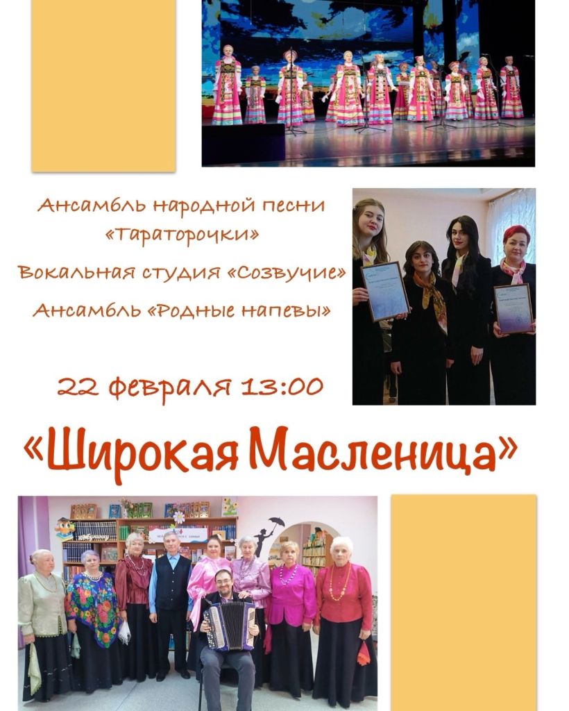 Приглашаем на праздник Широкой Масленицы, где читателей ждут выступления заслуженного коллектива народного творчества Липецкой области – ансамбля народной песни «Тараторочки» под руководством талантливой Надежды Петровны Брычеевой, чарующие голоса вокалистов студии «Созвучие», которую возглавляет педагог Светлана Анатольевна Отрошенко.